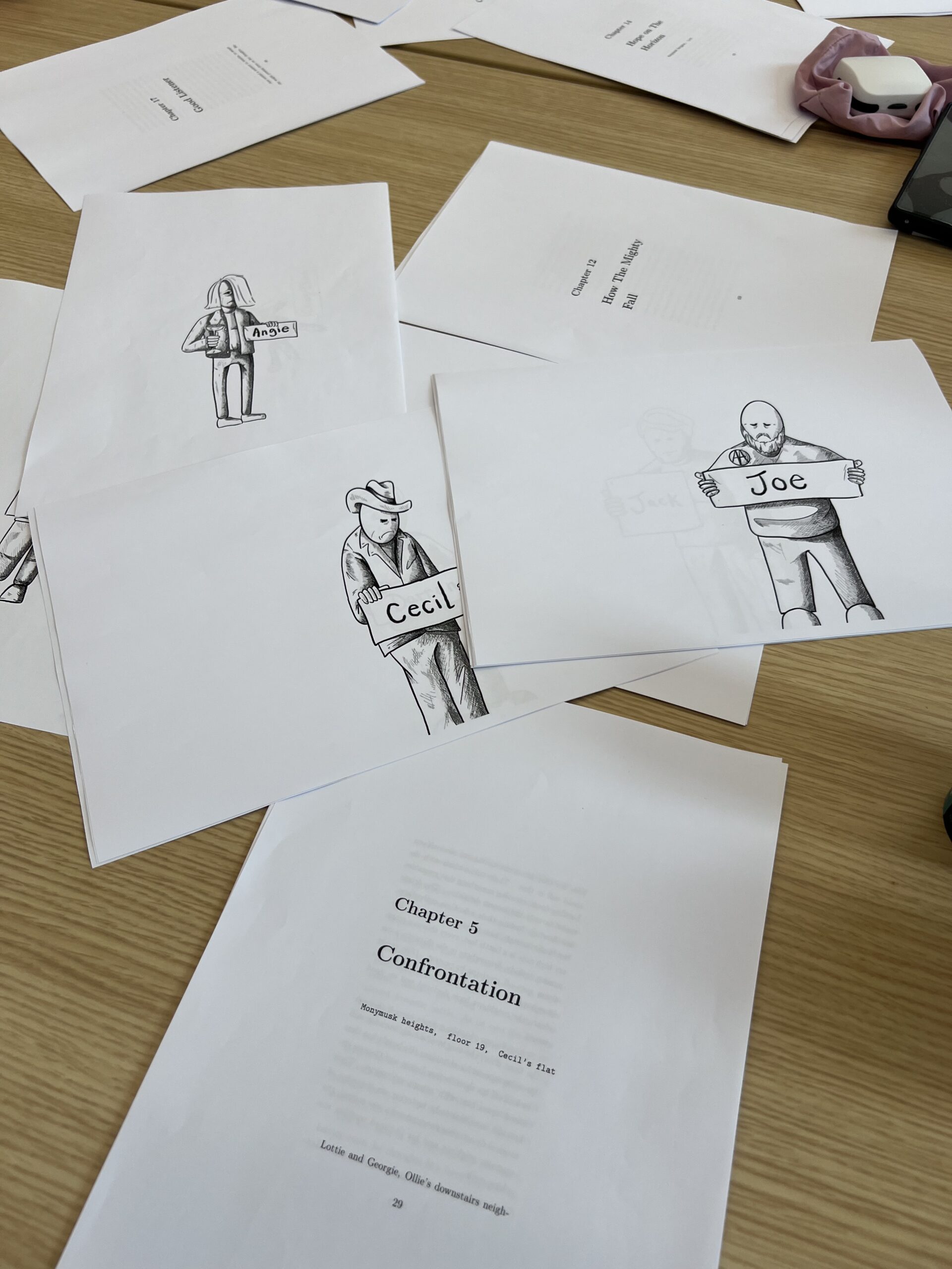 As the group wrote, I used Visual Inquiry techniques to sketch characters and scenes live, responding to the emerging narrative with expressive, intuitive drawings. These visuals helped the group imagine their story world and deepen their connection to the characters. Oscar Dickson then digitally rendered the illustrations for the main body and designed the striking front cover.